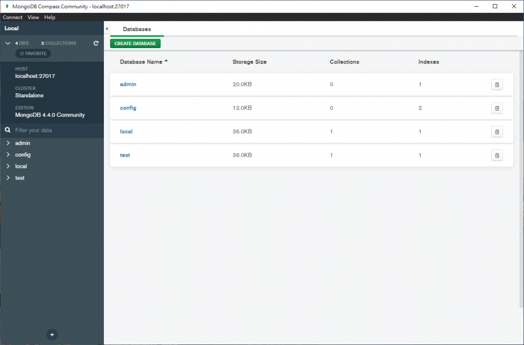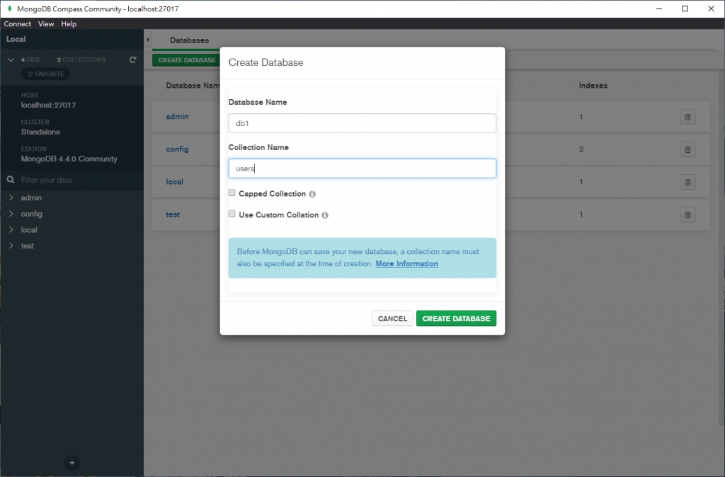 - 打開 MongoDB Compass 並按下 - Create Database。